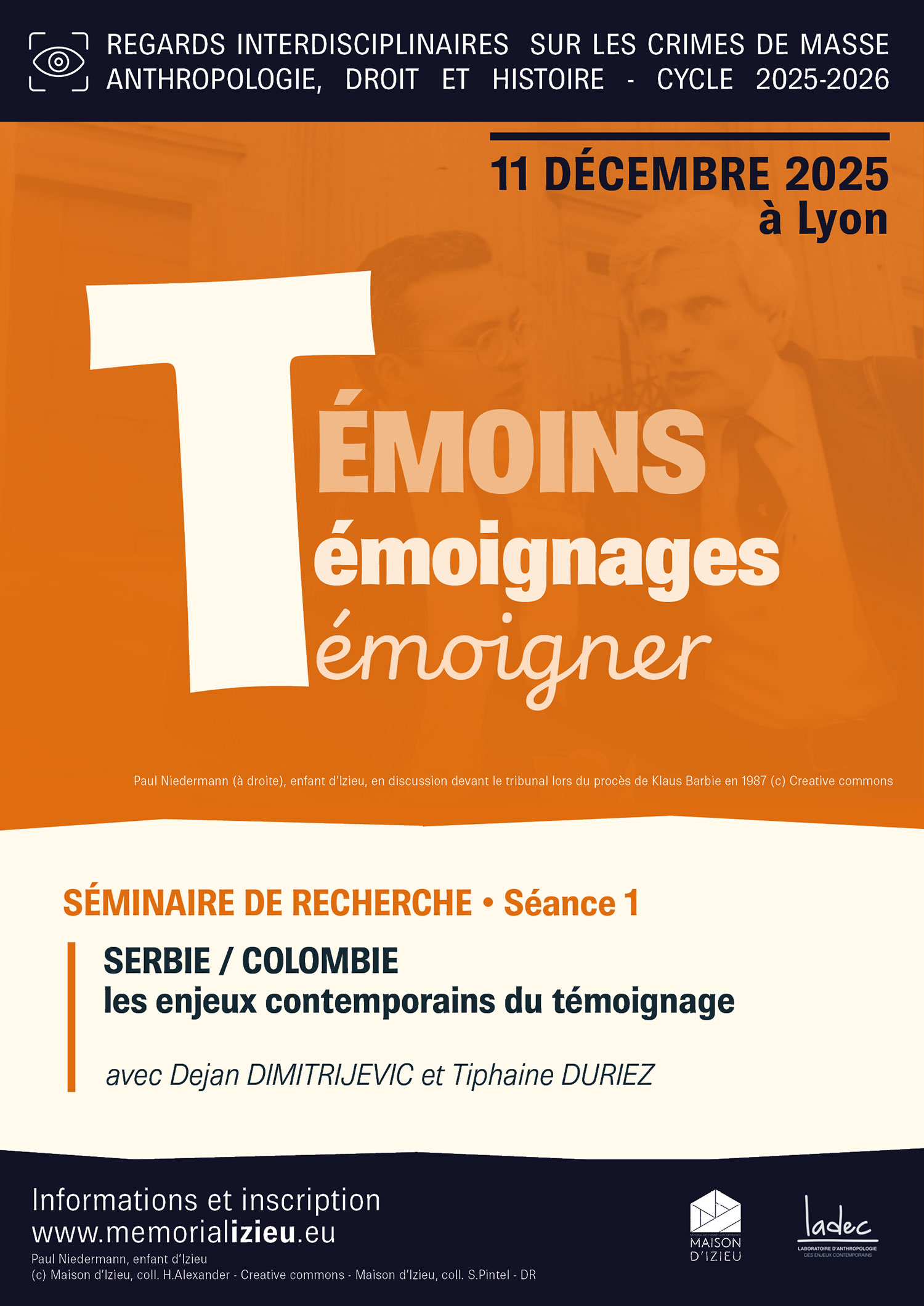 Première séance du cycle 2025-2026 du séminaire organisé par le Laboratoire d’anthropologie des enjeux contemporains (LADEC) et la Maison d’Izieu. Cette année, les crimes de masse sont désormais abordés sous l’angle « témoins, témoignages, témoigner », toujours en croisant les regards des différentes disciplines – Anthropologie, Droit et Histoire.