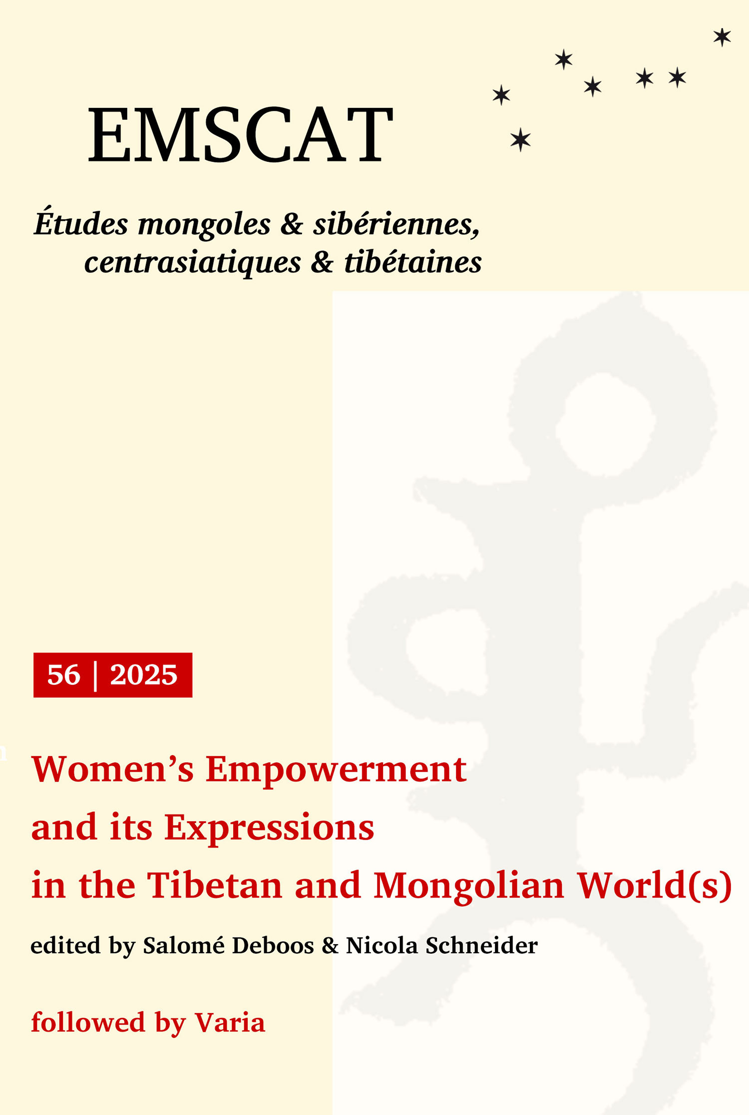 | La revue Études Mongoles a été fondée en 1970 par Roberte Hamayon. Réalisée dans le cadre du Laboratoire d’ethnologie et de sociologie comparative de Paris-X jusqu’en 2000, puis du Centre d’études mongoles et sibériennes de l’École Pratique des Hautes Études, elle l’est aujourd’hui dans celui de la Société des études mongoles et sibériennes. Son domaine s’est élargi à la Sibérie en 1976, puis à l’Asie centrale et au Tibet en 2004, pour devenir Études mongoles & sibériennes, centrasiatiques & tibétaines (EMSCAT). EMSCAT publie, en français ou en anglais, des travaux originaux de chercheurs français et étrangers. → En savoir plus |